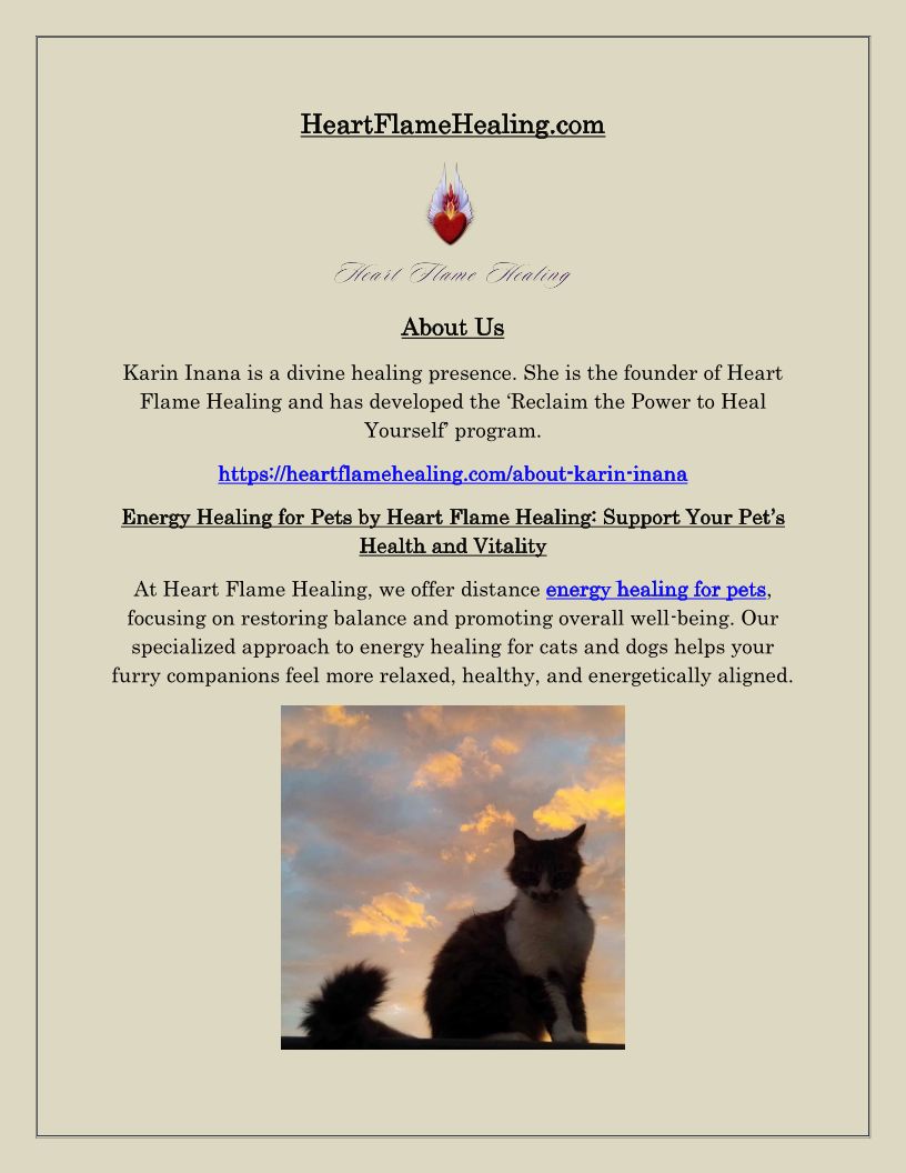 Karin Inana is a divine healing presence. She is the founder of Heart Flame Healing and has developed the ‘Reclaim the Power to Heal Yourself’ program. https://