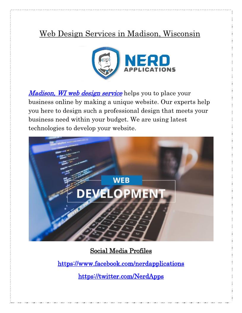 Nerd Applications is a Madison, Wisconsin based Web Development, Mobile App Development, Internet of Things, Cloud Services, Software Testing, SEO and Marketing