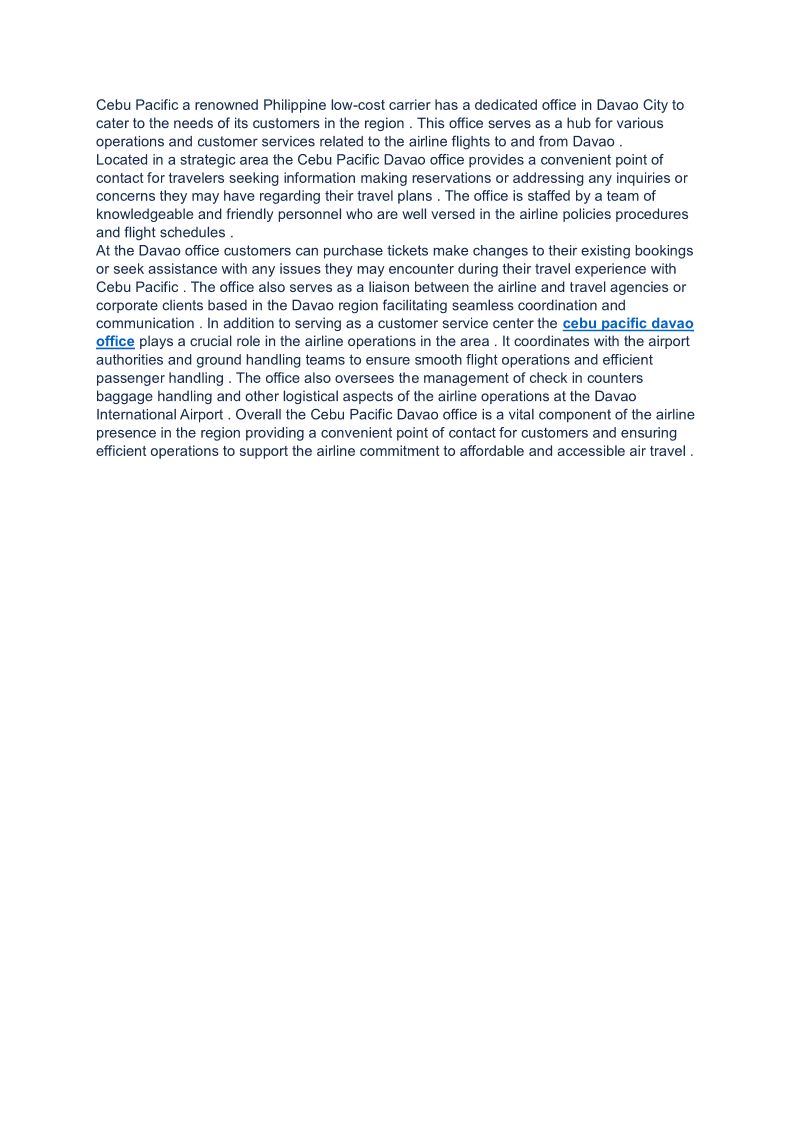 The Cebu Pacific Davao office also serves as a hub for the airline's local marketing and promotional activities. It collaborates closely with travel agencies, c