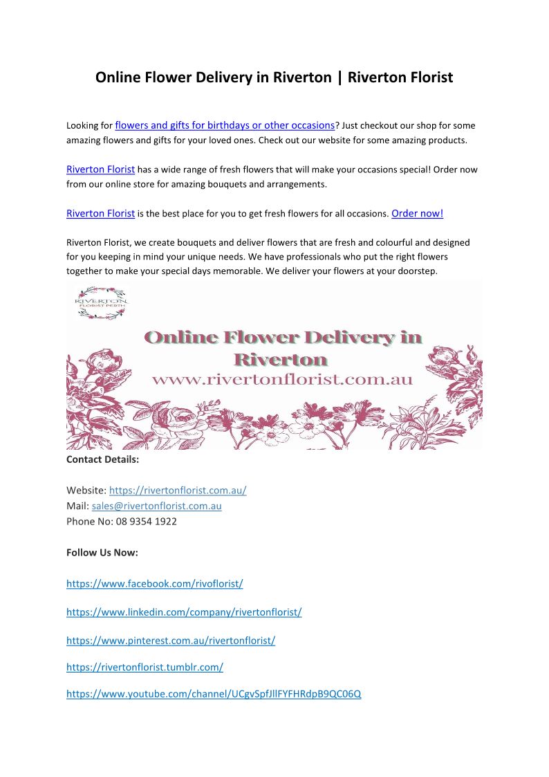 Riverton Florist is a leading online florist in Riverton specializes in flower gifts and bouquet delivery services in Riverton.