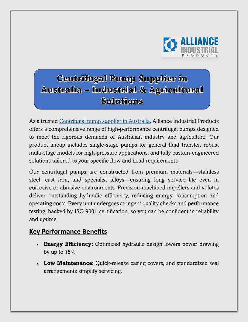 Alliance Industrial Products is a distinguished leader in designing, manufacturing, and delivering a comprehensive range of centrifugal pumps.