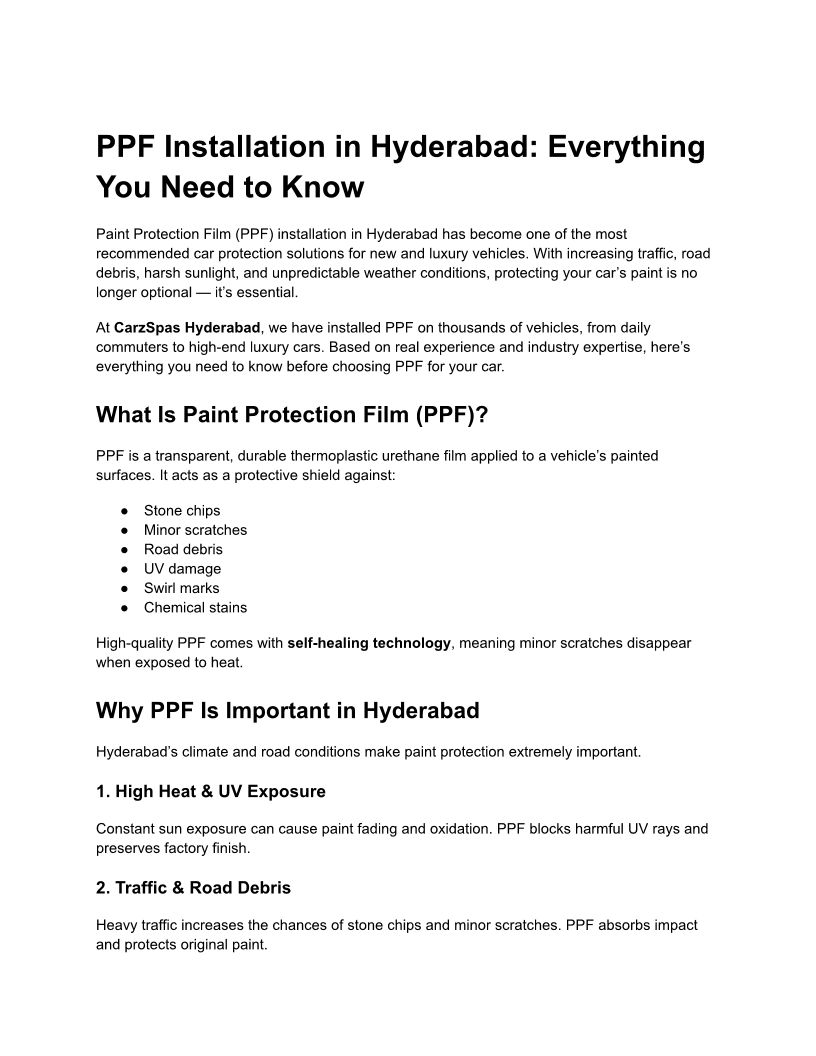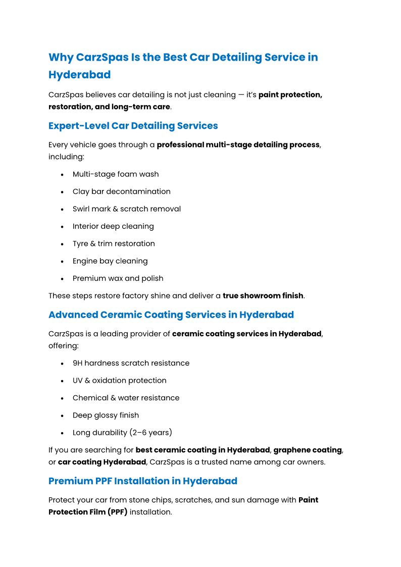 CarzSpas Hyderabad offers the best car detailing services in Hyderabad with expert ceramic coating, PPF installation, and premium car care.