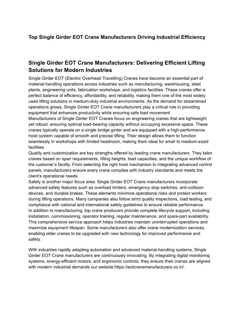 Single Girder EOT Crane Manu...
