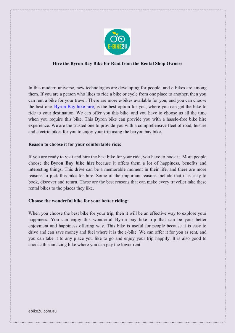 E-Bikes are environmentally friendly and fun! Slow down on your short break away from being busy and enjoy the easy discovery of Byron Bay .