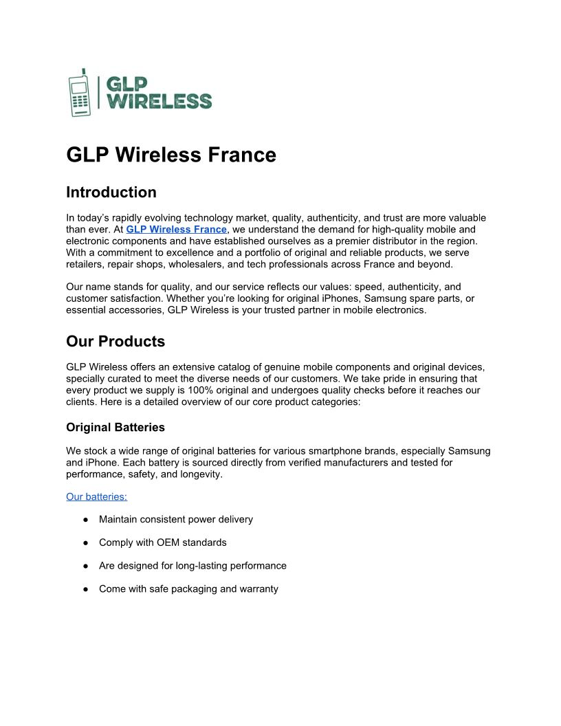GLP Wireless is one of the largest wholesalers of mobile phones in France, handling approximately 50,000 units per month across a diverse range of products.