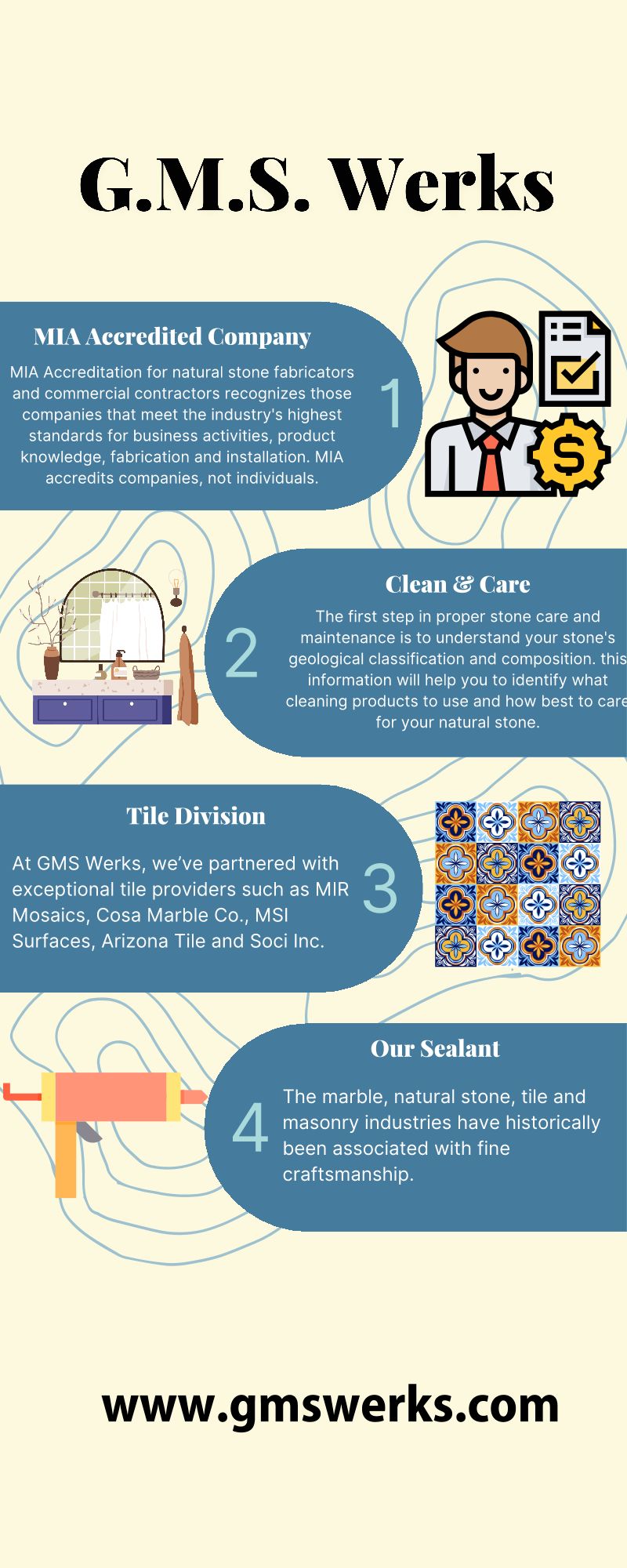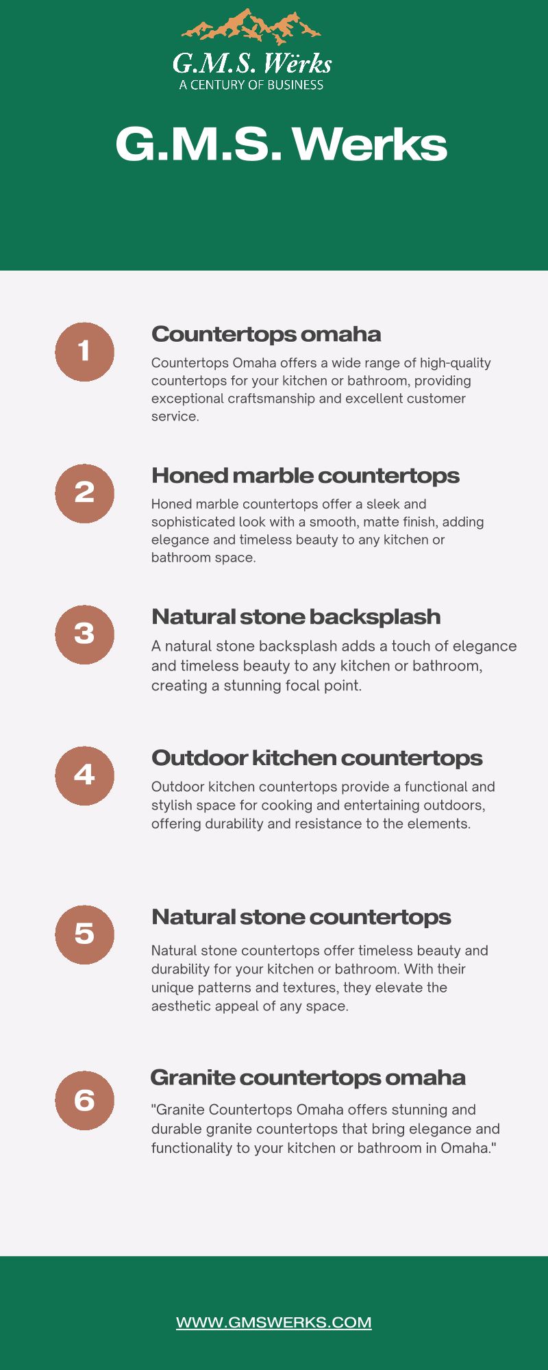 G.M.S. Wërks is a leading company of natural stones, centrally located in the heartland of America. We are a company who provides different types and designs of