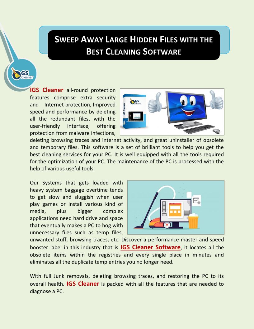 IGS Cleaner is a professional Top Computer Cleaning Software that identifies junk and potential threats and dusts them off within a few minutes.