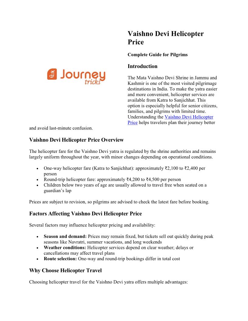Book your Vaishno Devi Helicopter and Battery Car online for a smooth journey. Get the best Katra to Vaishno Devi Helicopter Price and tour packages easily!