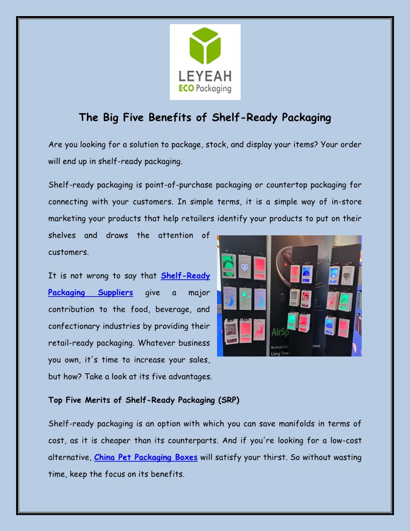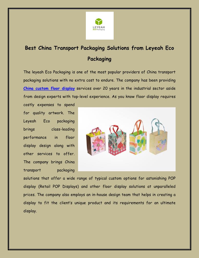 Shenzhen Leyeah Packaging Design Co., Ltd offers full packaging solutions to clients from concept design to prototyping, testing, manufacturing to logistics. Tw