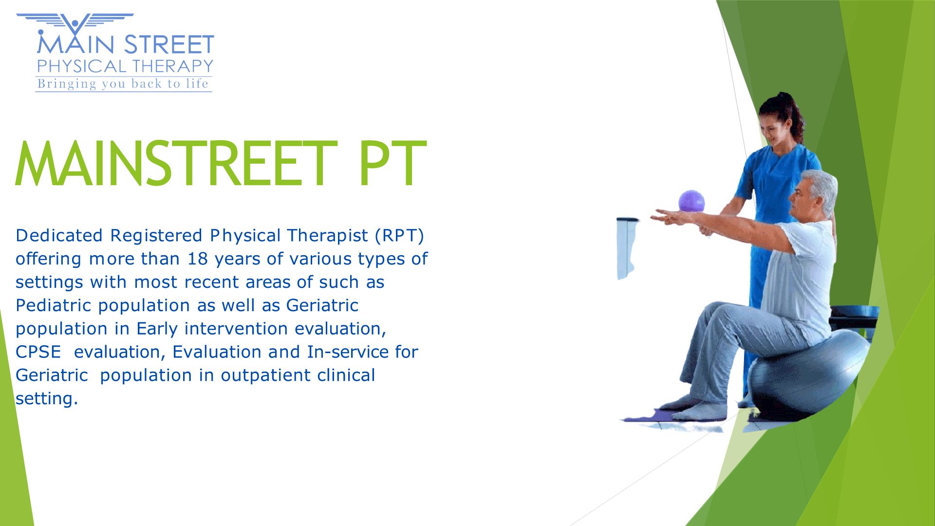 Dedicated Registered Physical Therapist (RPT) offering more than 18 years of various types of settings with most recent areas of such as Pediatric population as
