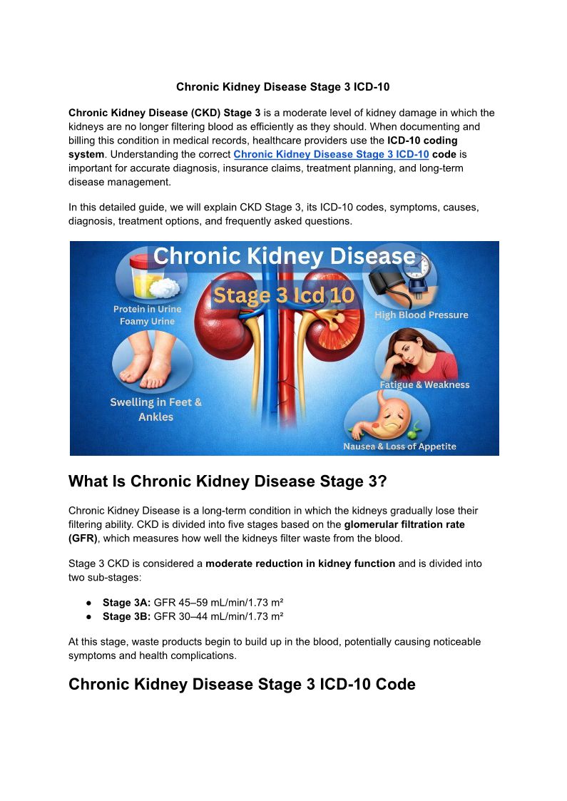 Chronic Kidney Disease Stage 3 ICD-10 refers to the medical coding classification used to diagnose and document moderate kidney damage.