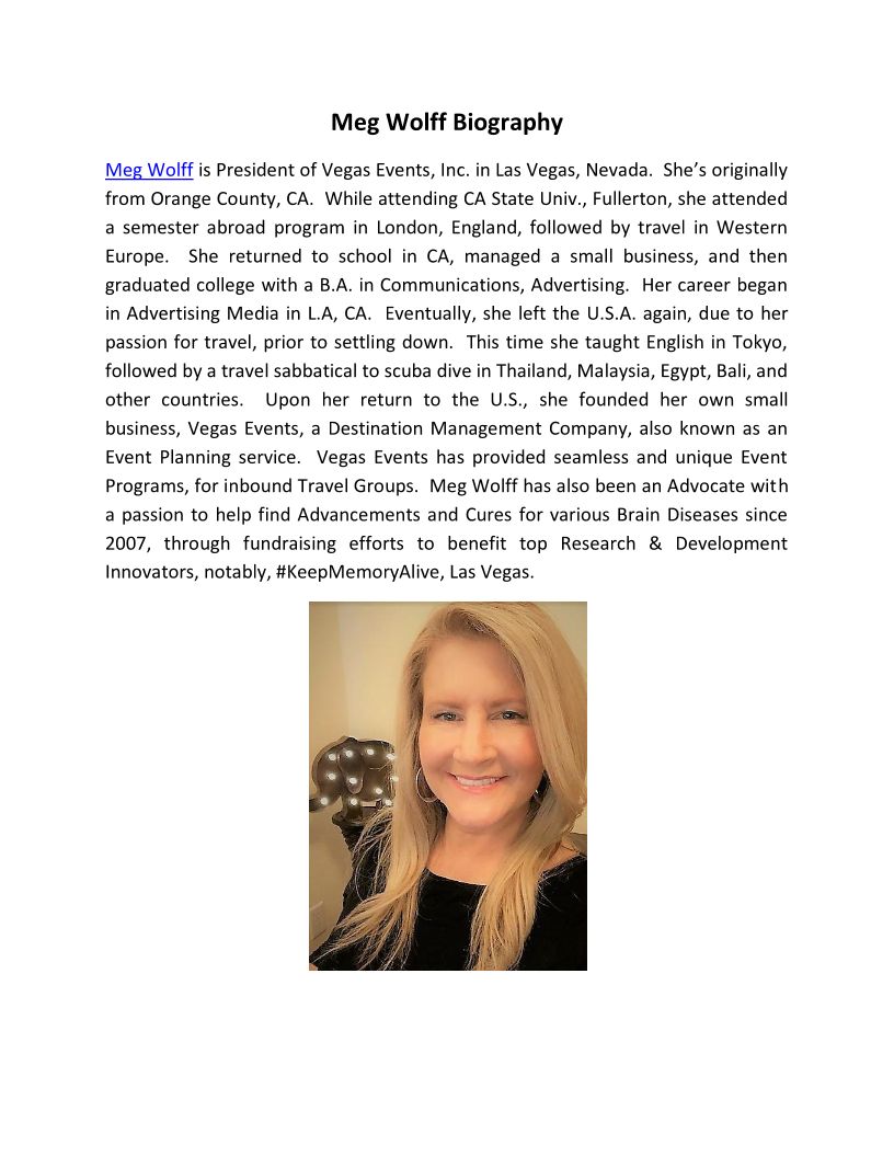 Meg Wolff has been an Advocate for finding Advancements and Cures for Brain Disease, and she was the Advocate for a loved one with long term illness.