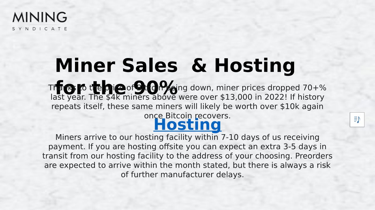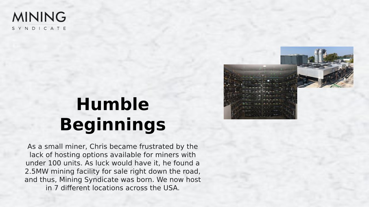 Mining Syndicate found a 2.5MW mining facility for sale right down the road. They now host in 4 different locations across the USA.