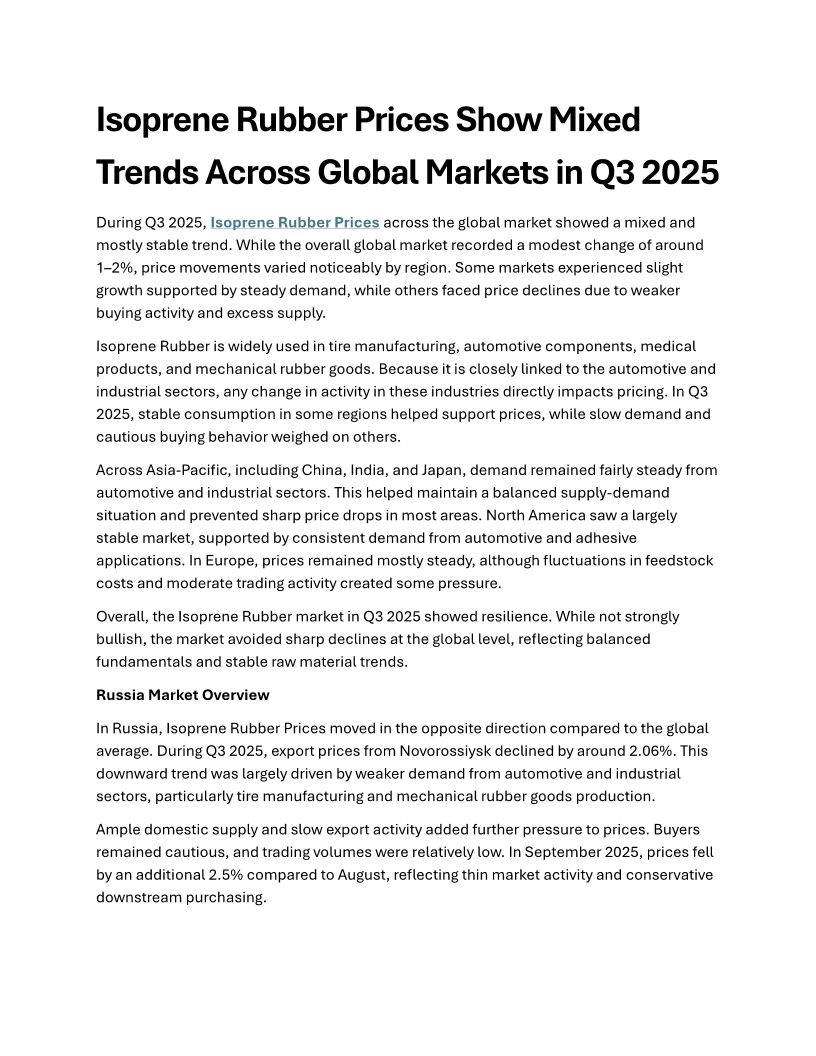 India Isoprene Rubber Prices...