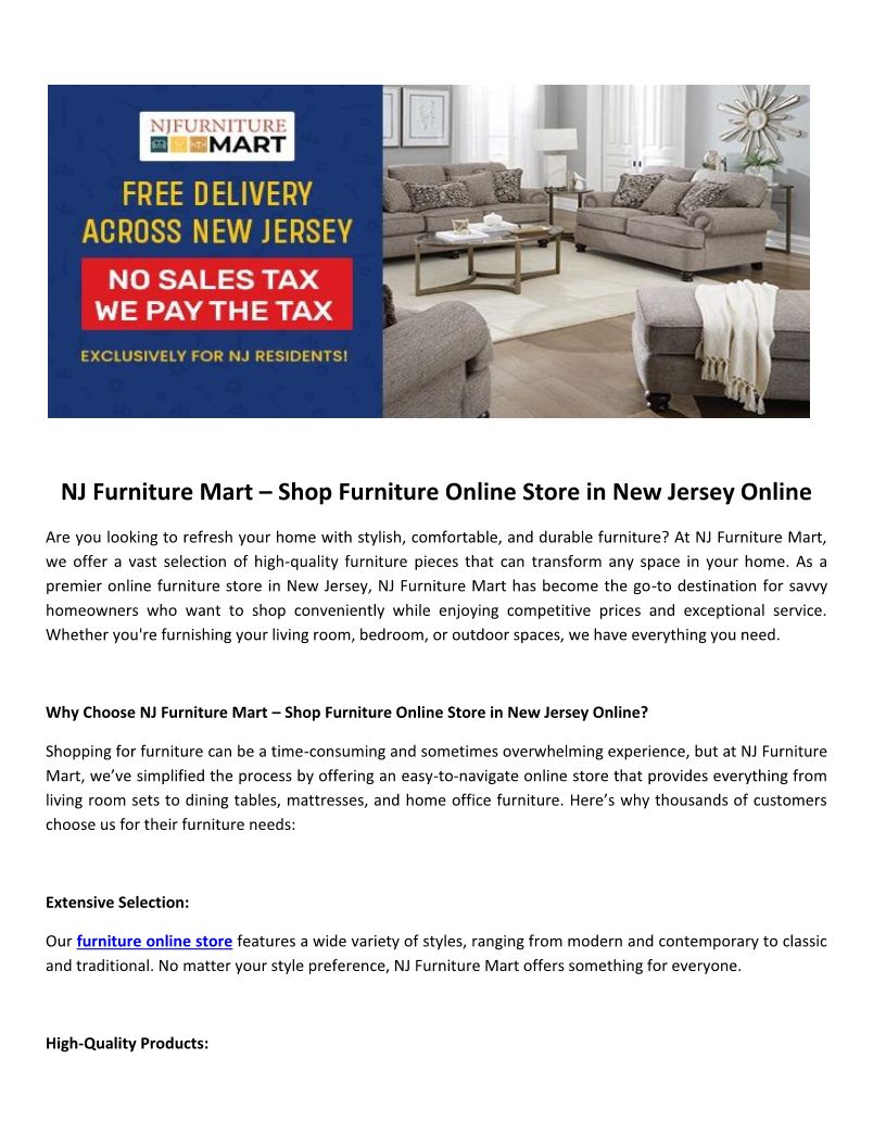 NJ Furniture Mart for top-tier furniture & stylish designs. Our online store boasts a diverse range of high-quality furniture options for all areas of your home
