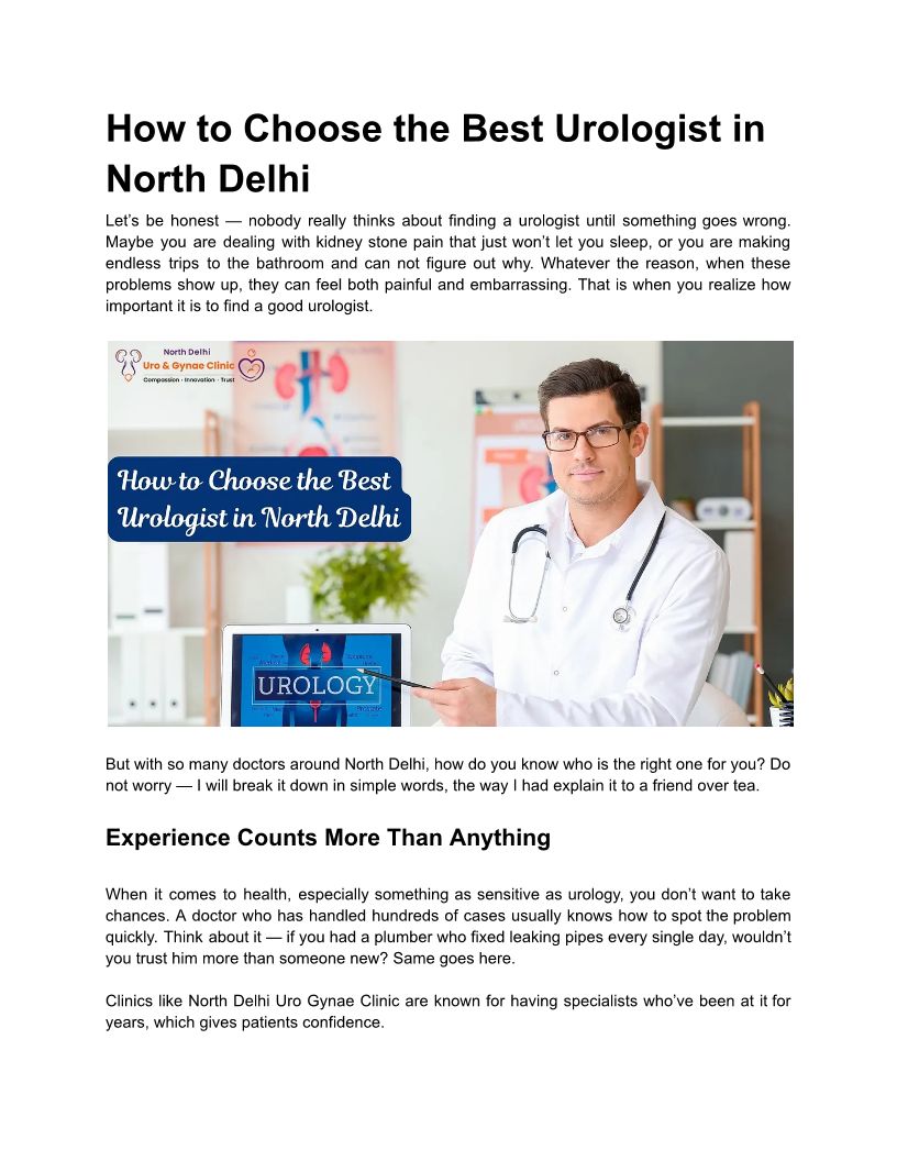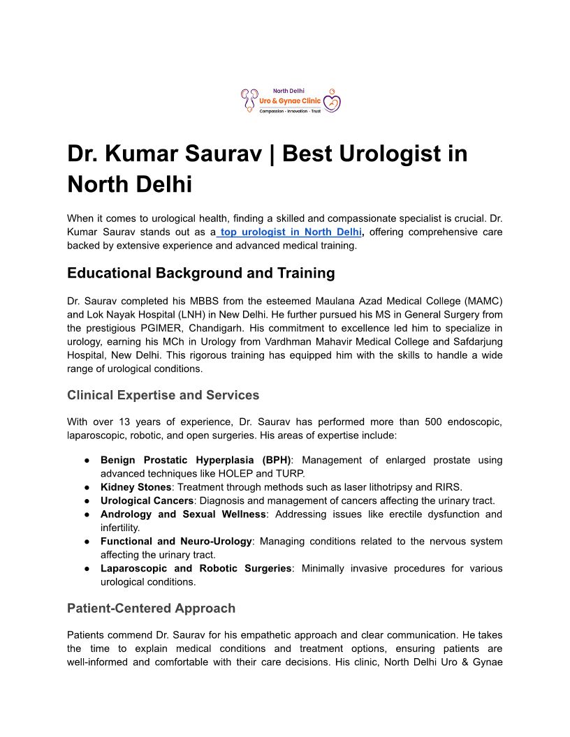 North Delhi Urogynae Clinic is a trusted clinic for advanced urology and gynecology care, led by Dr. Kumar Saurav (Urologist) and Dr. Anju Bala (Gynaecologist).