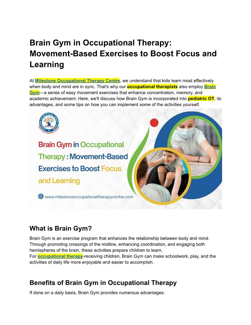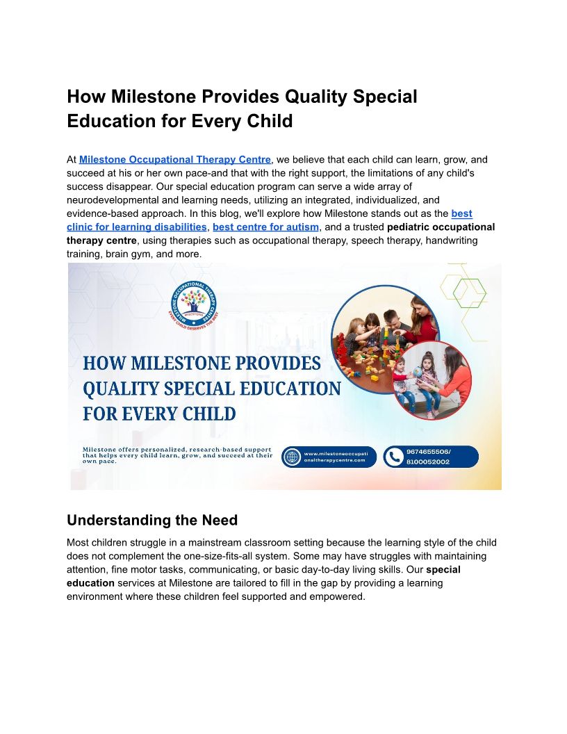 Milestone Occupational Therapy Centre offers specialized therapies for children, including occupational, speech, and sensory integration therapy etc.