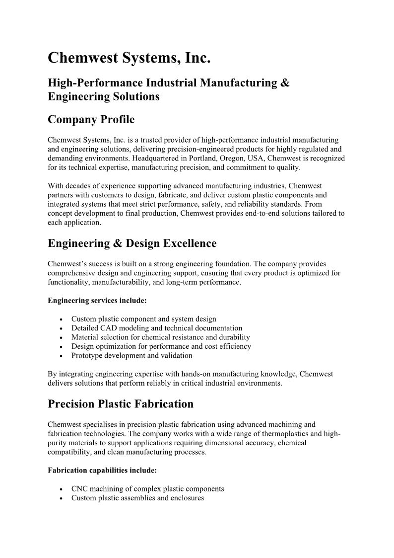 Chemwest Systems High-Performance Industrial Manufacturing & Engineering Solutions