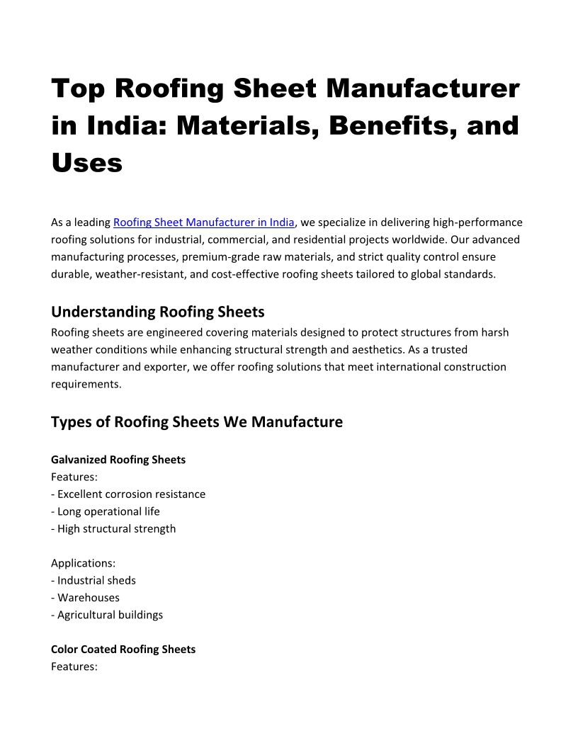 Top Roofing Sheet Manufacturer in India Materials, Benefits, and Uses