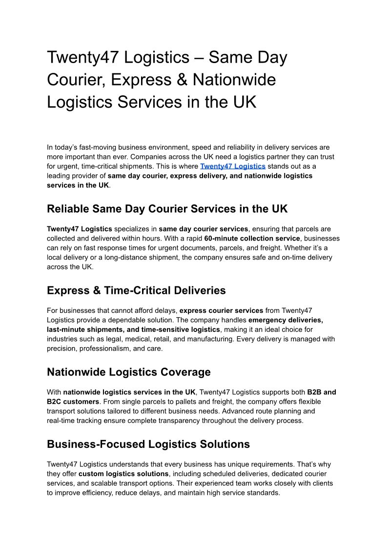 Twenty47 Logistics – Same Day Courier, Express & Nationwide Logistics Services in the UK