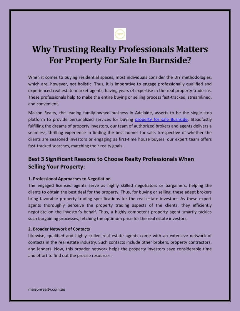 Why Trusting Realty Professionals Matters For Property For Sale In Burnside