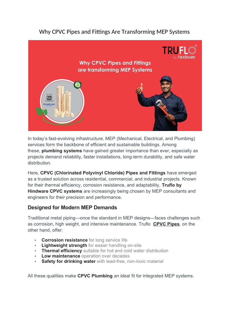 Why CPVC Pipes and Fittings Are Transforming MEP Systems