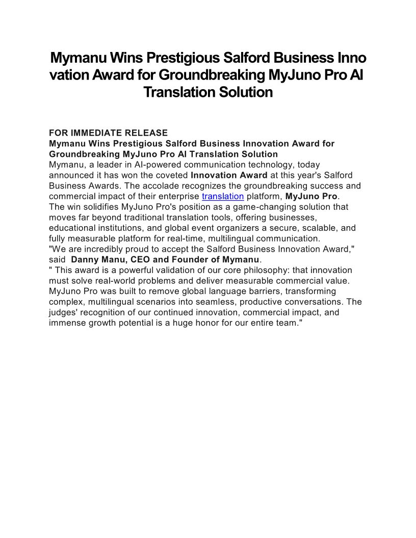 Mymanu Wins Prestigious Salford Business Innovation Award for Groundbreaking MyJuno Pro AI Translation Solution