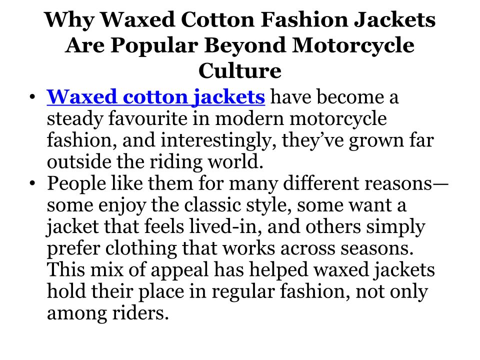 How Waxed Cotton Jackets Became a Timeless Wardrobe Staple Beyond Motorcycling