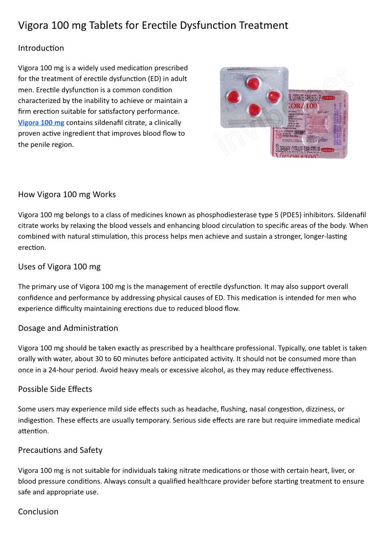 Vigora 100 mg Tablets for Erectile Dysfunction Treatment