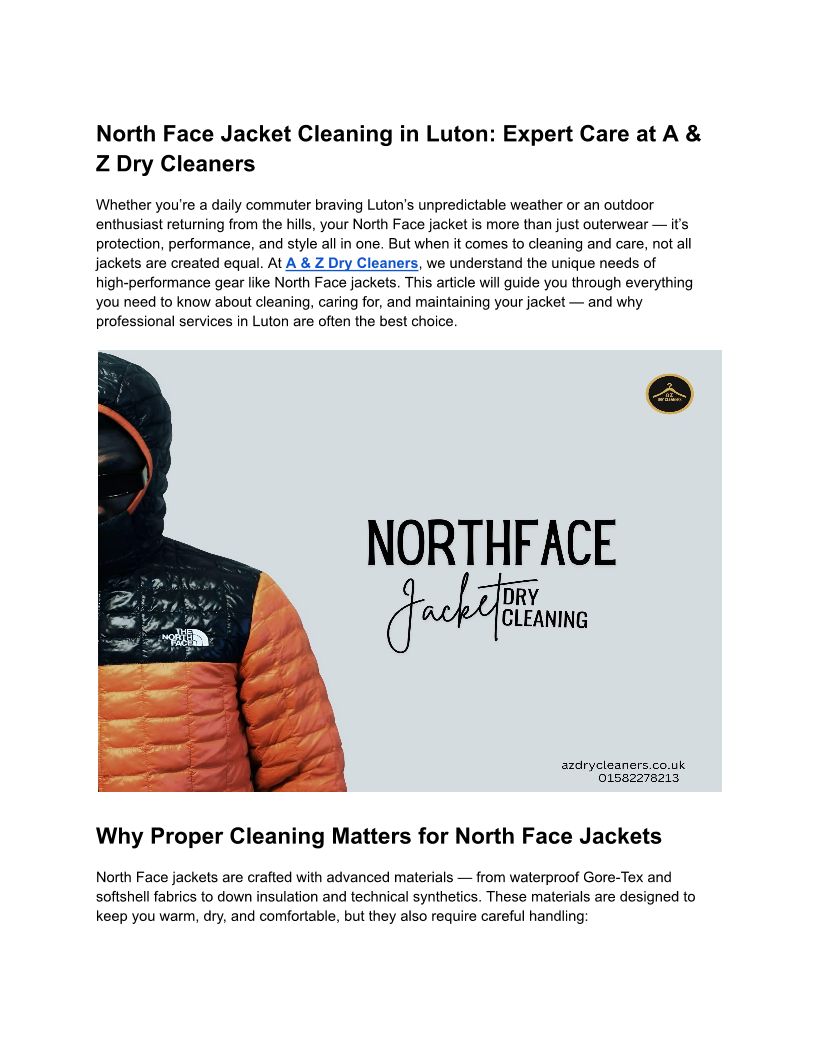 North Face Jacket Cleaning in Luton- A & Z Dry Cleaners