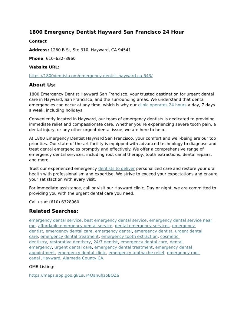 1800 Emergency Dentist Hayward San Francisco 24 Hour - 1260 B St, Ste 310, Hayward, CA 94541