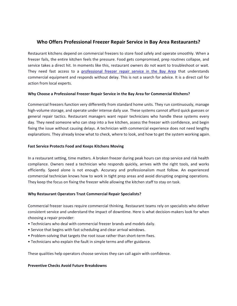 Who Offers Professional Freezer Repair Service in Bay Area Restaurants?