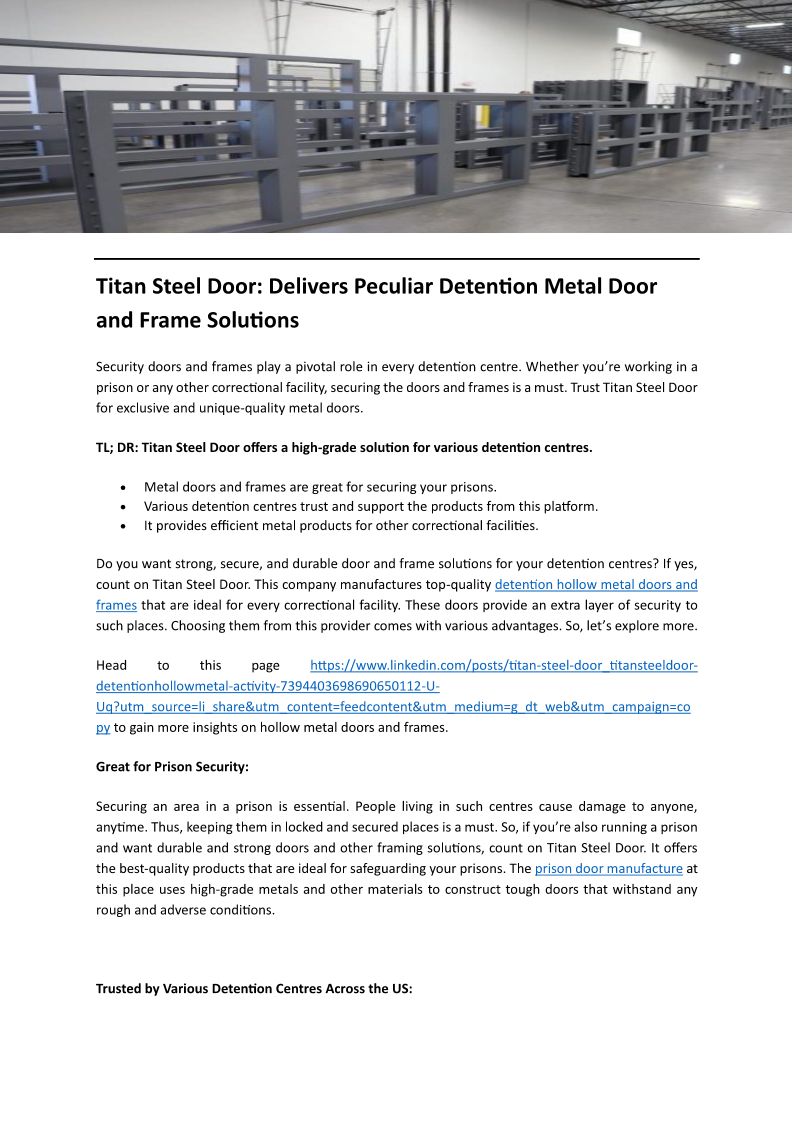 Titan Steel Door Delivers Peculiar Detention Metal Door and Frame Solutions