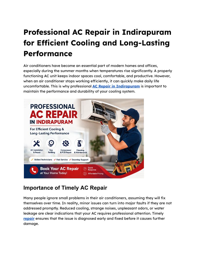Professional AC Repair in Indirapuram for Efficient Cooling and Long-Lasting Performance