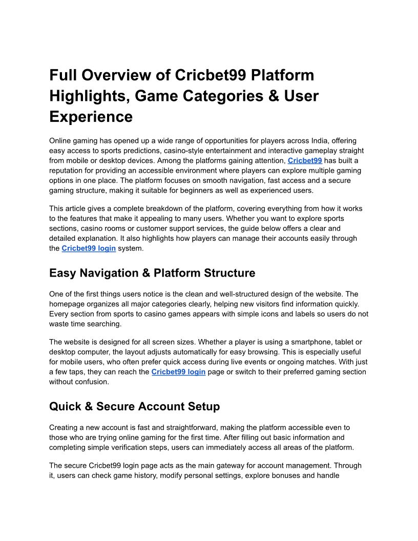 Full Overview of Cricbet99 Platform Highlights, Game Categories & User Experience