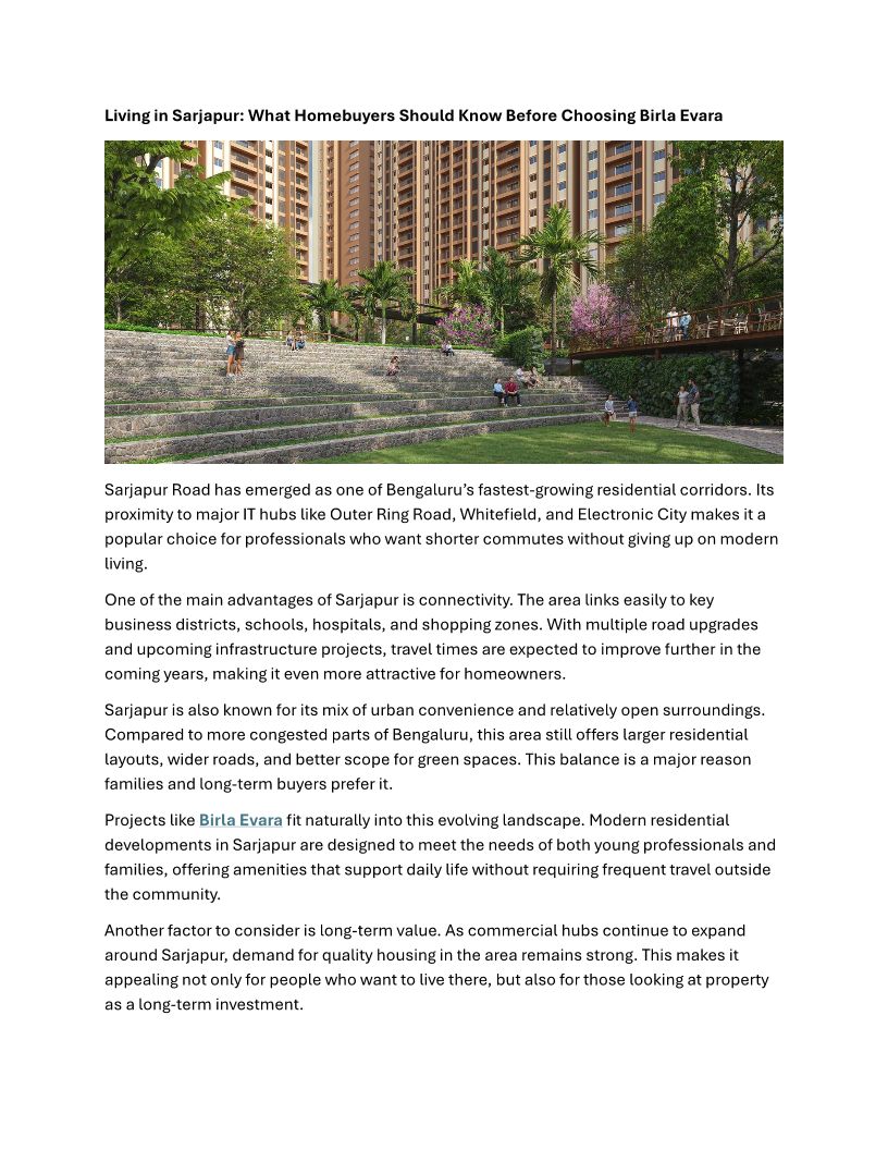 Living in Sarjapur- What Homebuyers Should Know Before Choosing Birla Evara