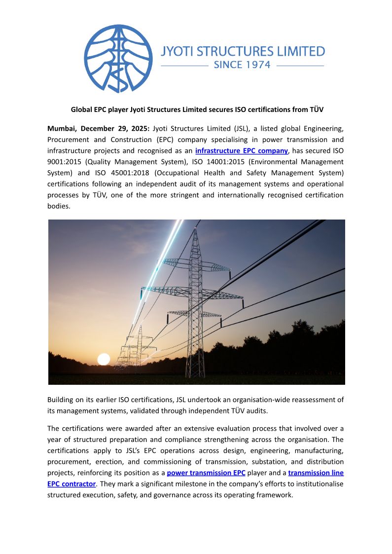 Global EPC player Jyoti Structures Limited secures ISO certifications from TÜV