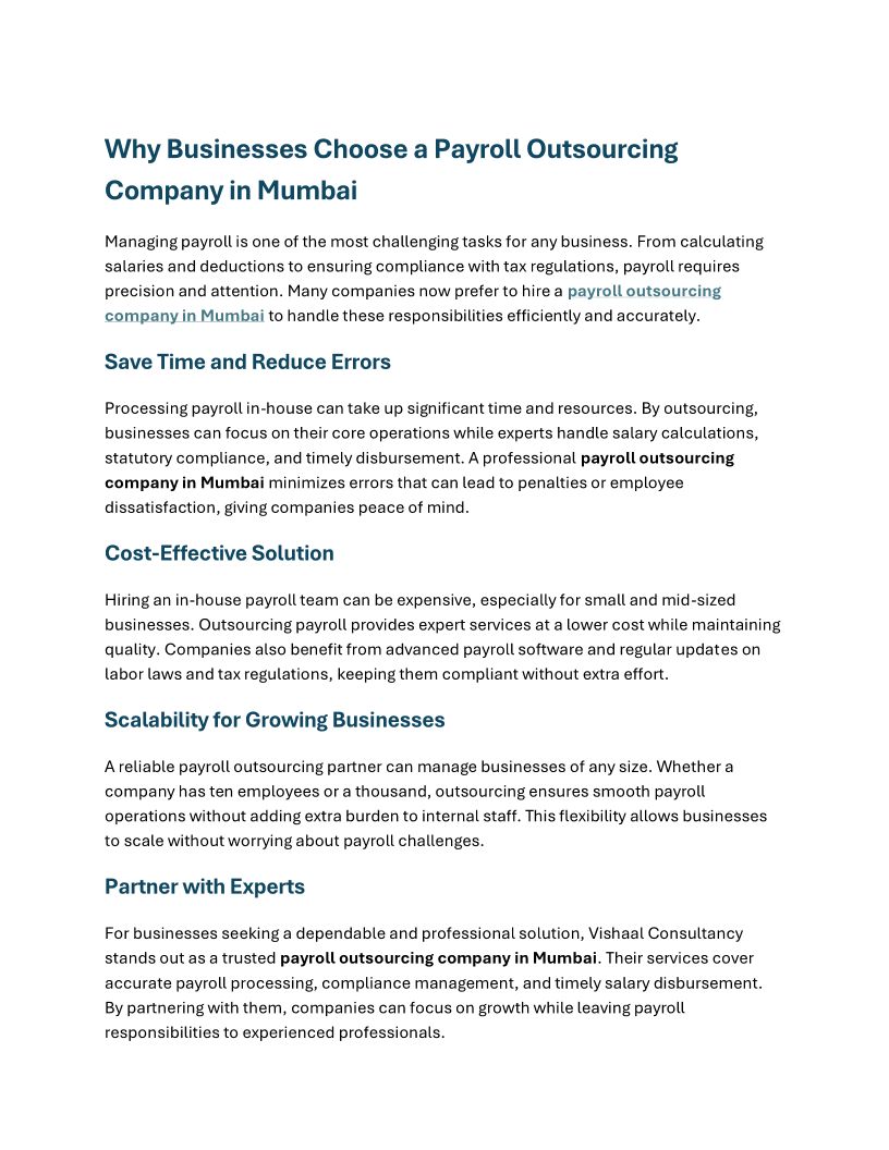 Why Businesses Choose a Payroll Outsourcing Company in Mumbai_Vishal Consultancy
