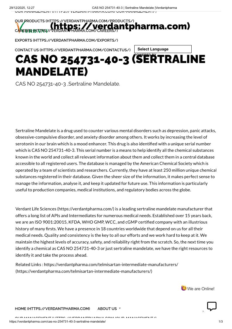 CAS NO 254731-40-3 _ Sertraline Mandelate _Verdantpharma