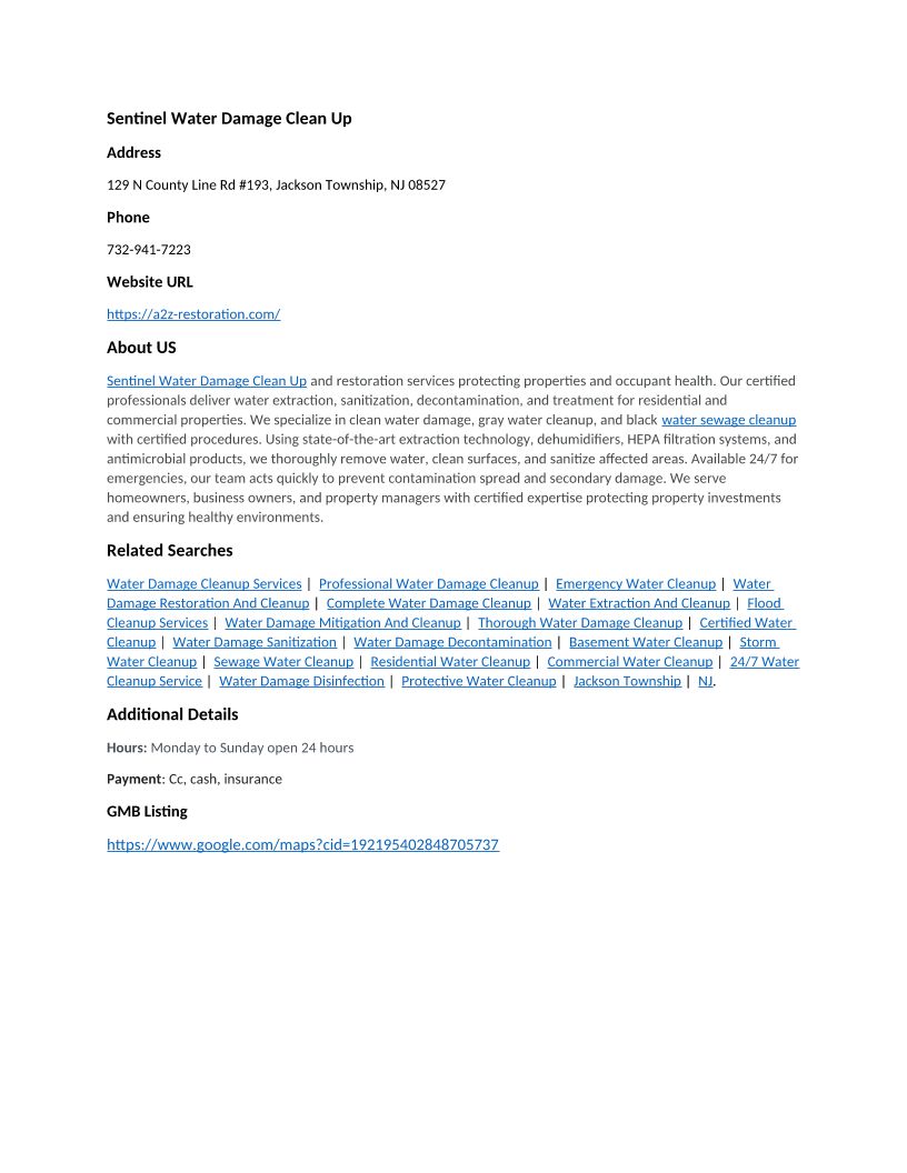 Sentinel Water Damage Clean Up - 129 N County Line Rd #193, Jackson Township, NJ 08527