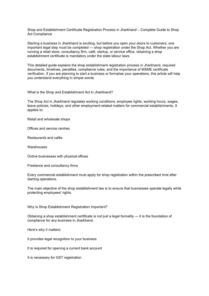 Jharkhand Shop Establishment & Shop Act Registration | MSME Certificate Verification Guide