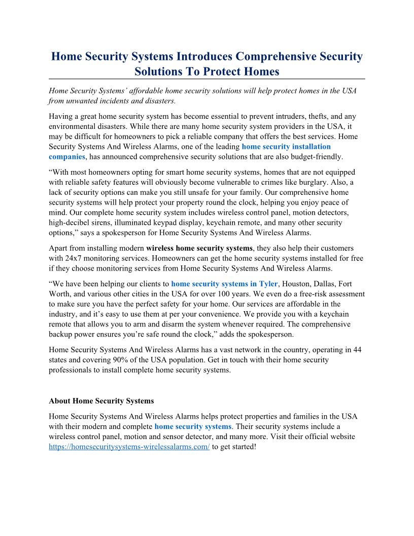 Home Security Systems Introduces Comprehensive Security Solutions To Protect Homes