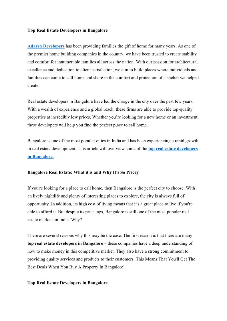 Top Real Estate Developers in Bangalore - Adarsh Developer