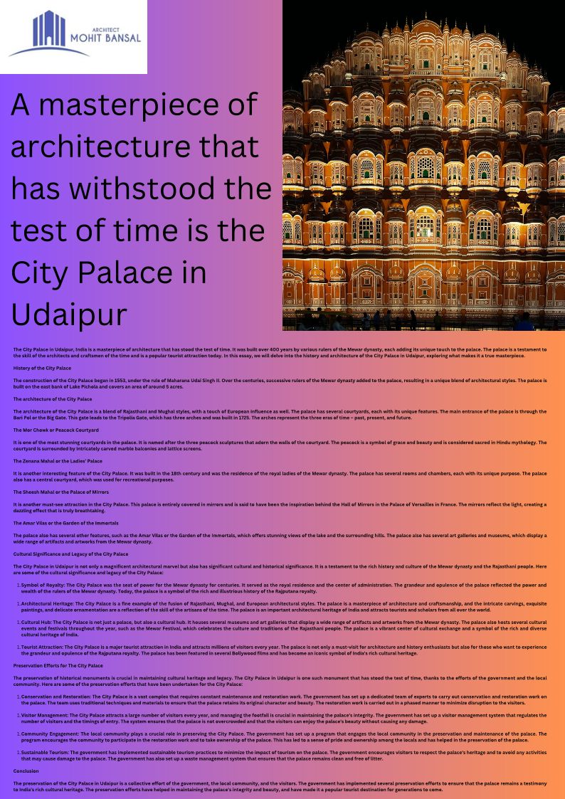 A masterpiece of architecture that has withstood the test of time is the City Palace in Udaipur By Mohit Bansal Chandigarh