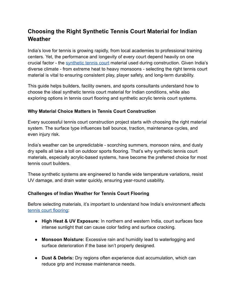 Choosing the Right Synthetic Tennis Court Material for Indian Weather