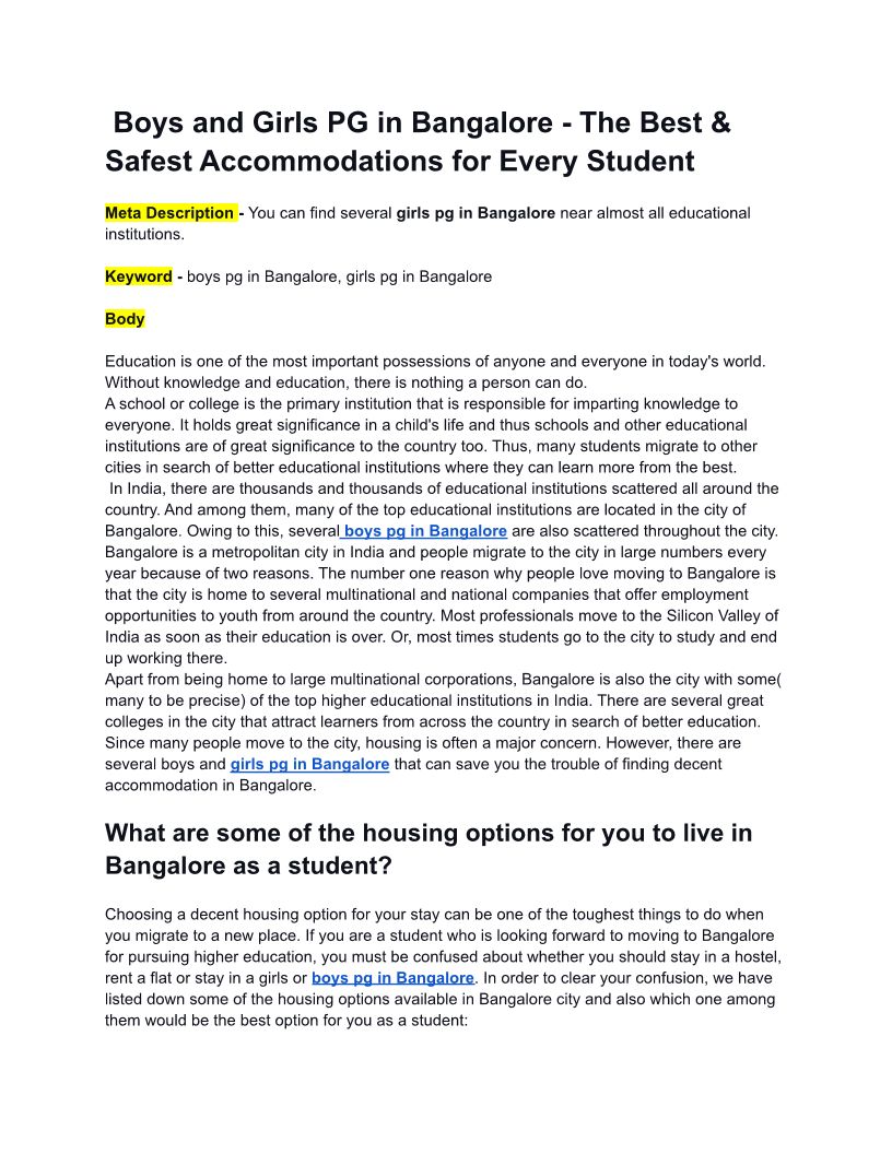 Boys and Girls PG in Bangalore - The Best & Safest Accommodations for Every Student