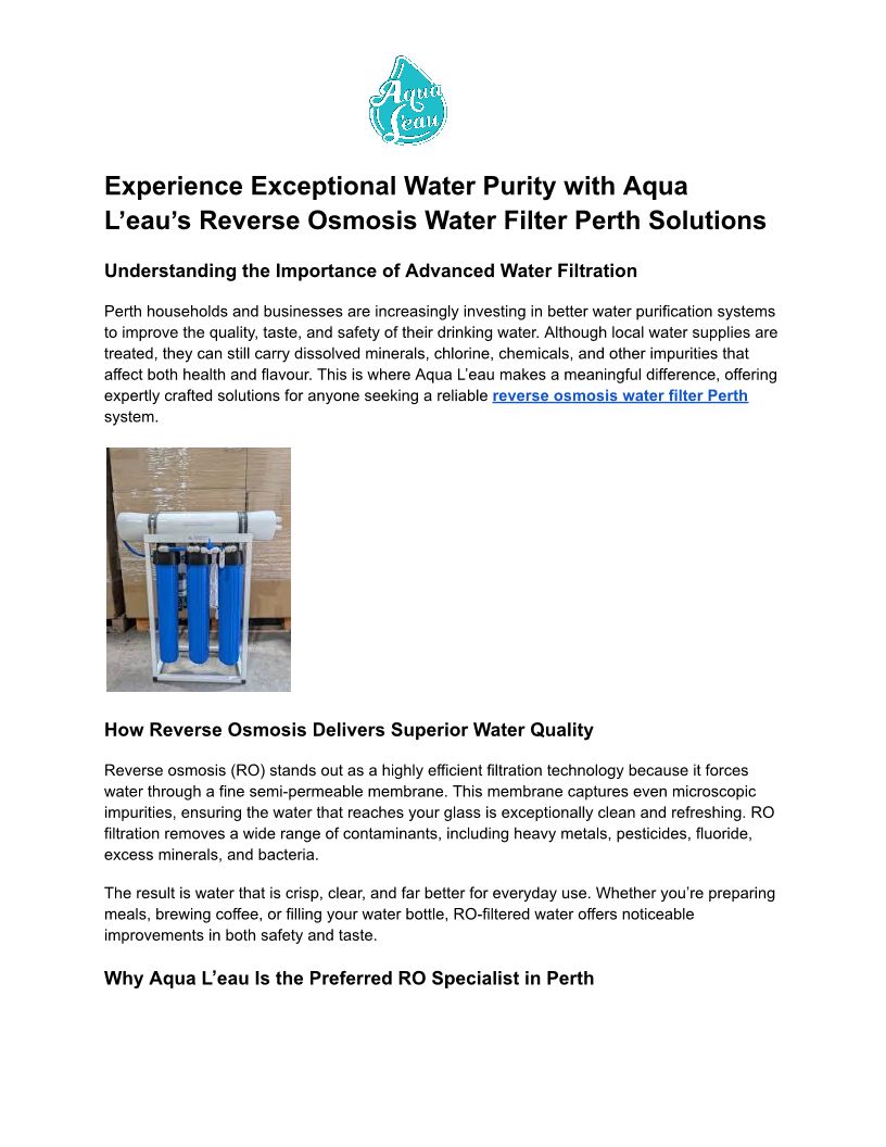 Experience Exceptional Water Purity with Aqua L’eau’s Reverse Osmosis Water Filter Perth Solutions