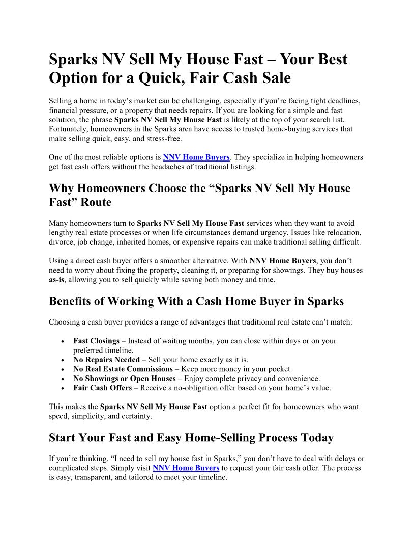 Sparks NV Sell My House Fast – Your Best Option for a Quick, Fair Cash Sale
