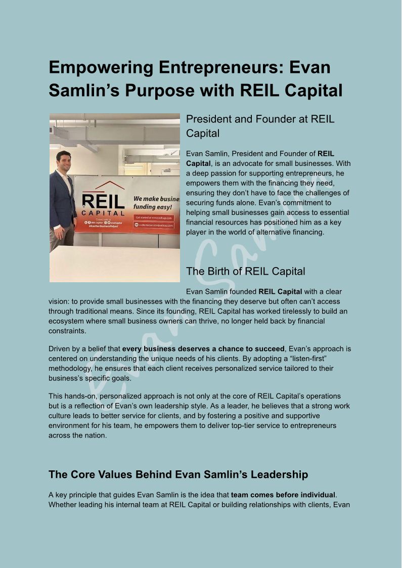 Empowering Entrepreneurs: Evan Samlin’s Purpose with REIL Capital