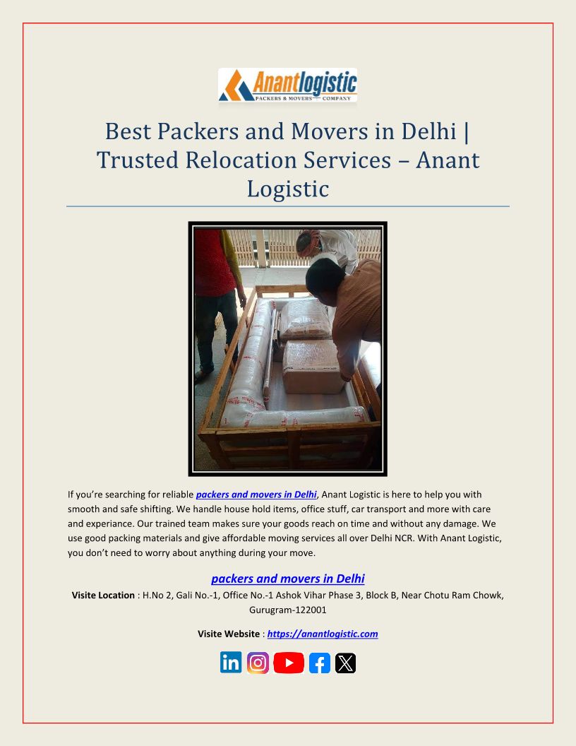 Best Packers and Movers in Delhi Trusted Relocation Services – Anant Logistic